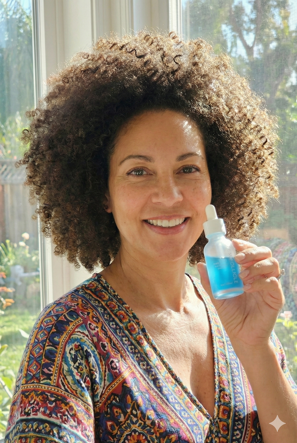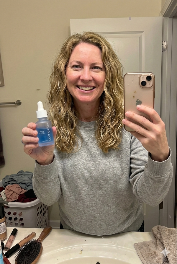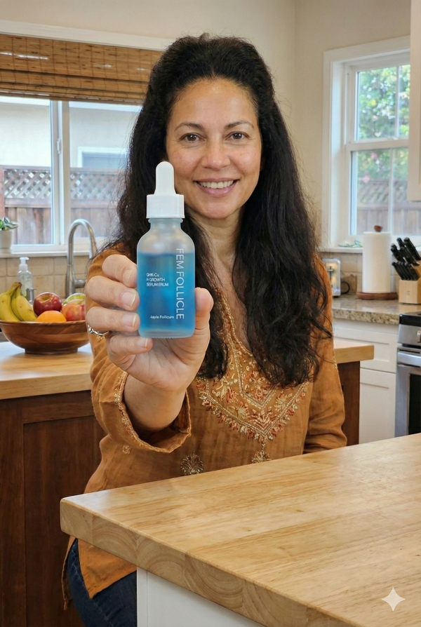 Most traditional treatments (like Minoxidil) work by harsh vasodilation, which often causes irritation and an initial "dread shed" phase where you lose hair before you grow it. Fem Follicle uses GHK-Cu Copper Peptides, a biological approach that signals your follicles to wake up and rebuild the scalp's health naturally. This means no shedding phase, no hormonal side effects, and no dependency on harsh chemicals.
